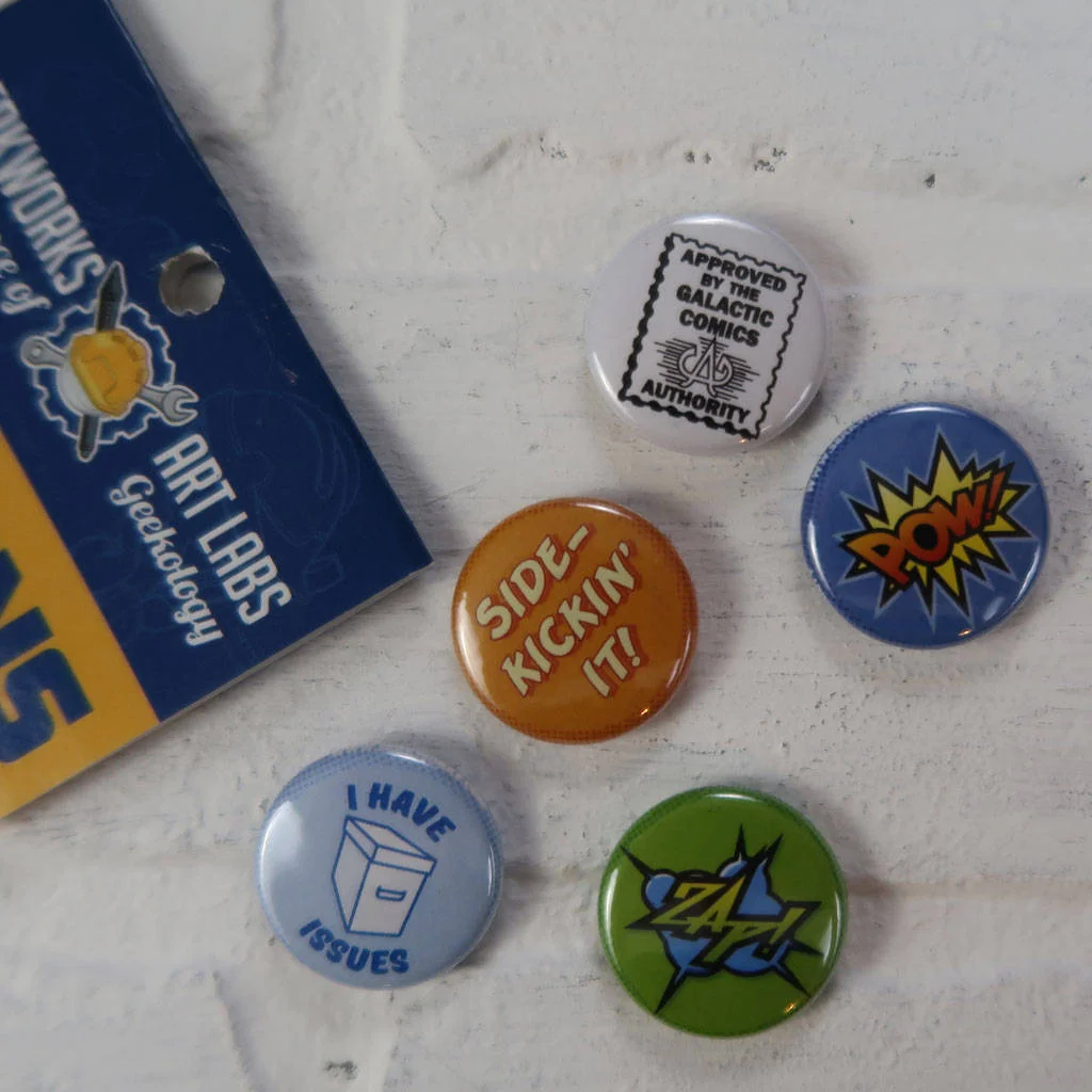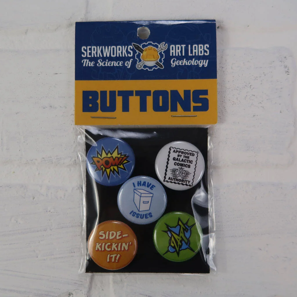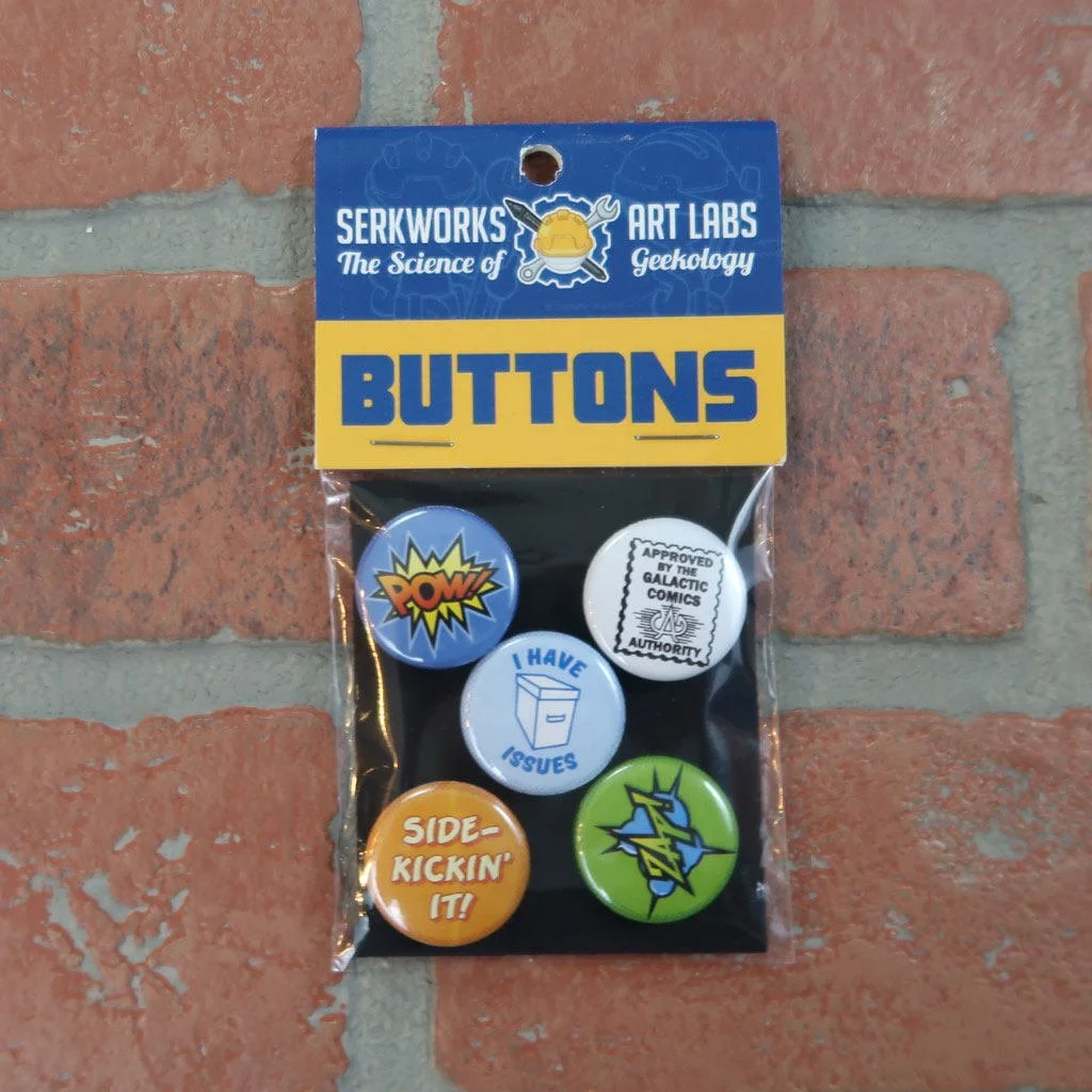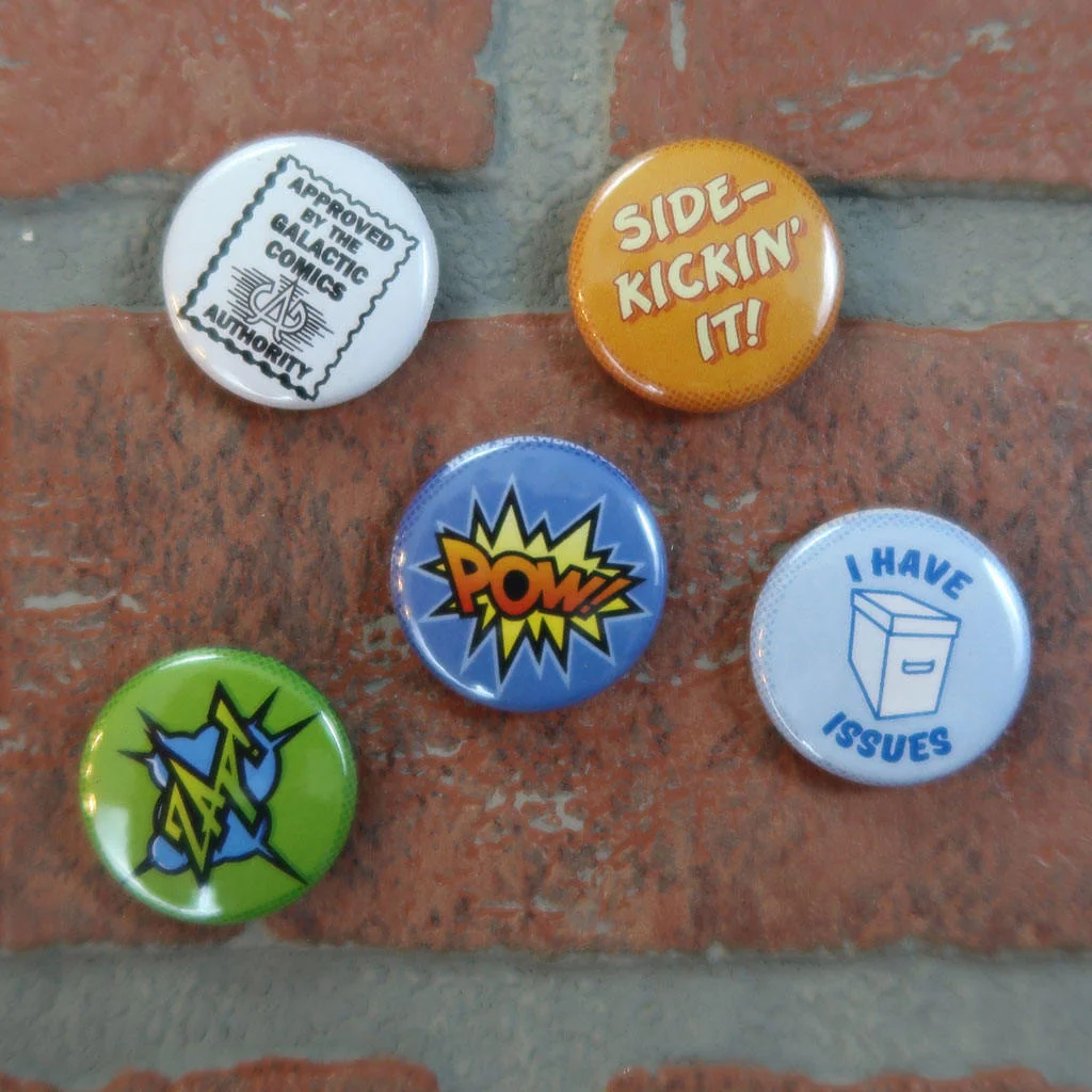 This pack of five comic book themed buttons really packs a punch! Featuring the following buttons: Approved by the Galactic Comics Authority, Side Kickin-It, I Have Issues, Zap and Pow!