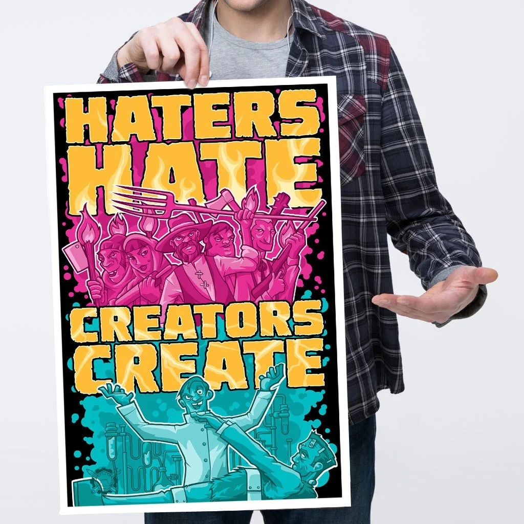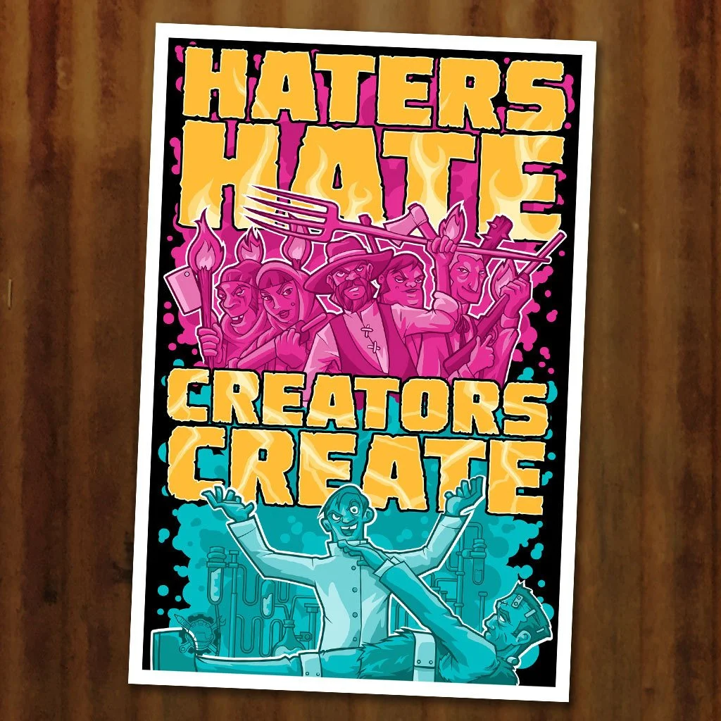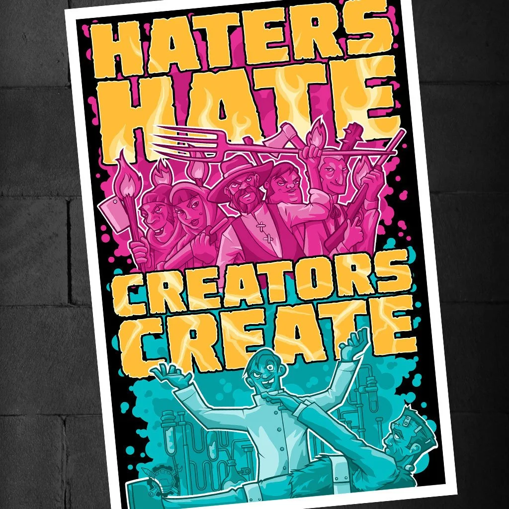 ...but creators can't but help but create. Show the haters they can't get you down by proudly displaying this inspirational wall print. That angry mob couldn't stop Dr. Frankenstein. OK, maybe they did, but his legacy still lives on, and Serkworks Art Labs has captured his indomitable spirit for creativity in this bold new design that is sure to inspire!