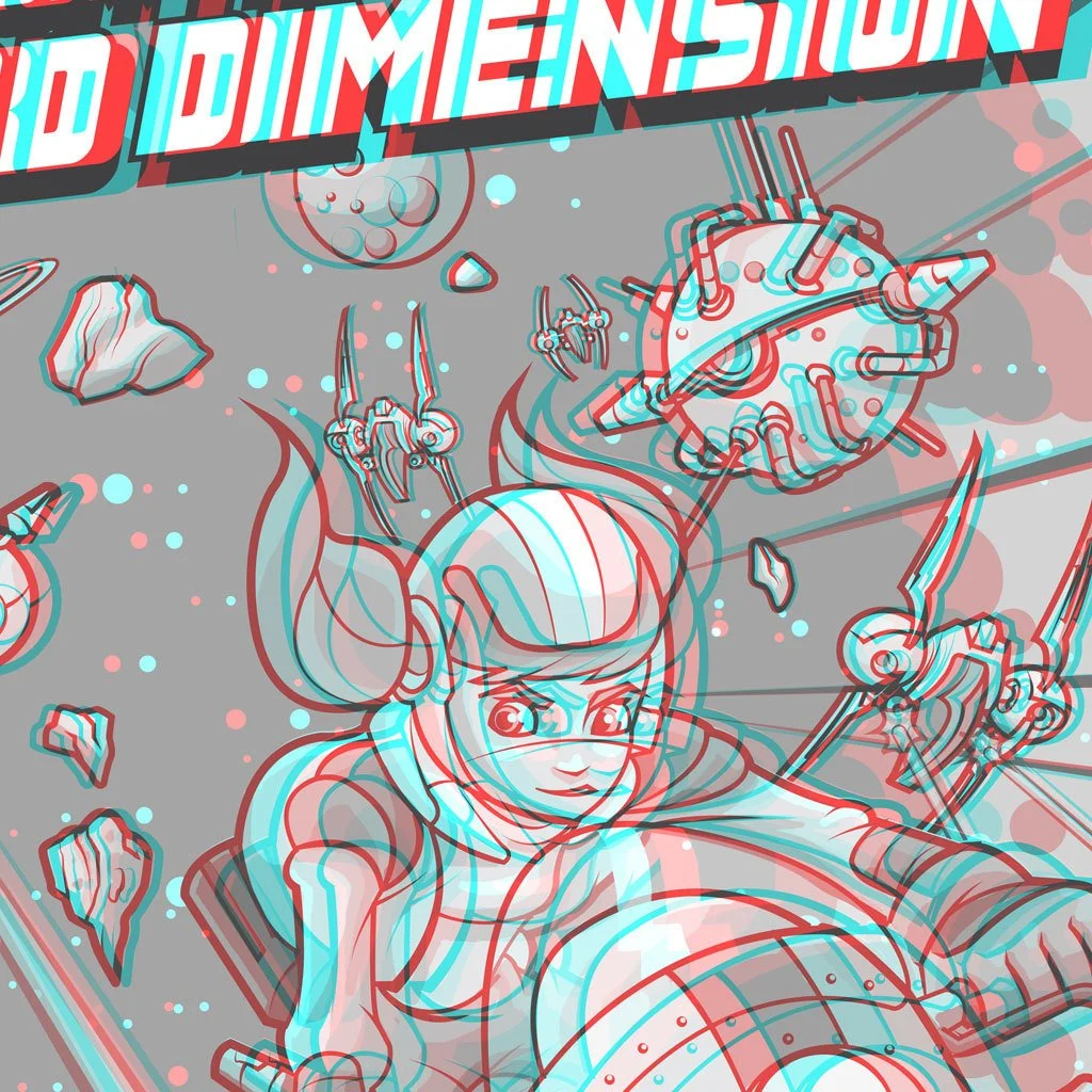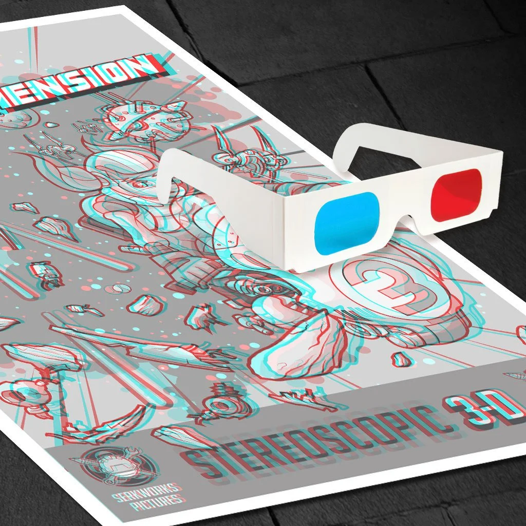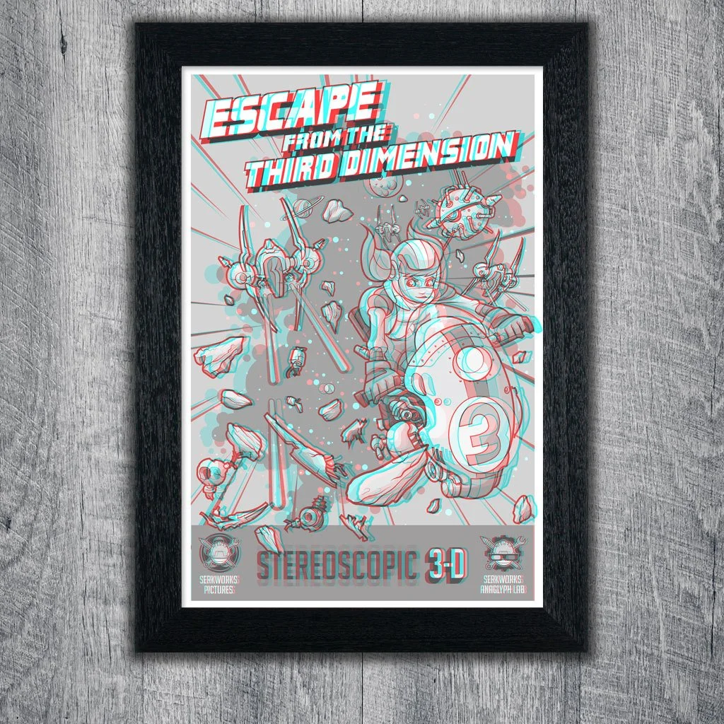 3D games, 3D movies, 3D Printing. It seems that nowadays everyone has gone 3D crazy. But truth be told, 3D technology has been around for a long time beginning with Stereographic Photography. Now Serkworks Art Labs has made this process new again by applying these same tried and true techniques to our own print making process. This amazing art print featuring epic space battles and alien worlds, and comes complete with 3D glasses (included). It really pops! It's sure to be an exciting conversation piece for your home, or the perfect gift for that special geek in your life!