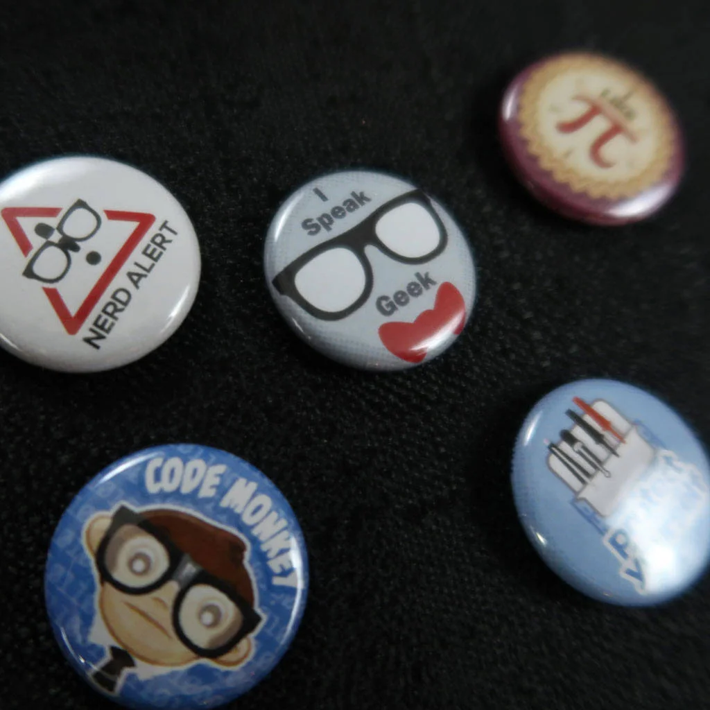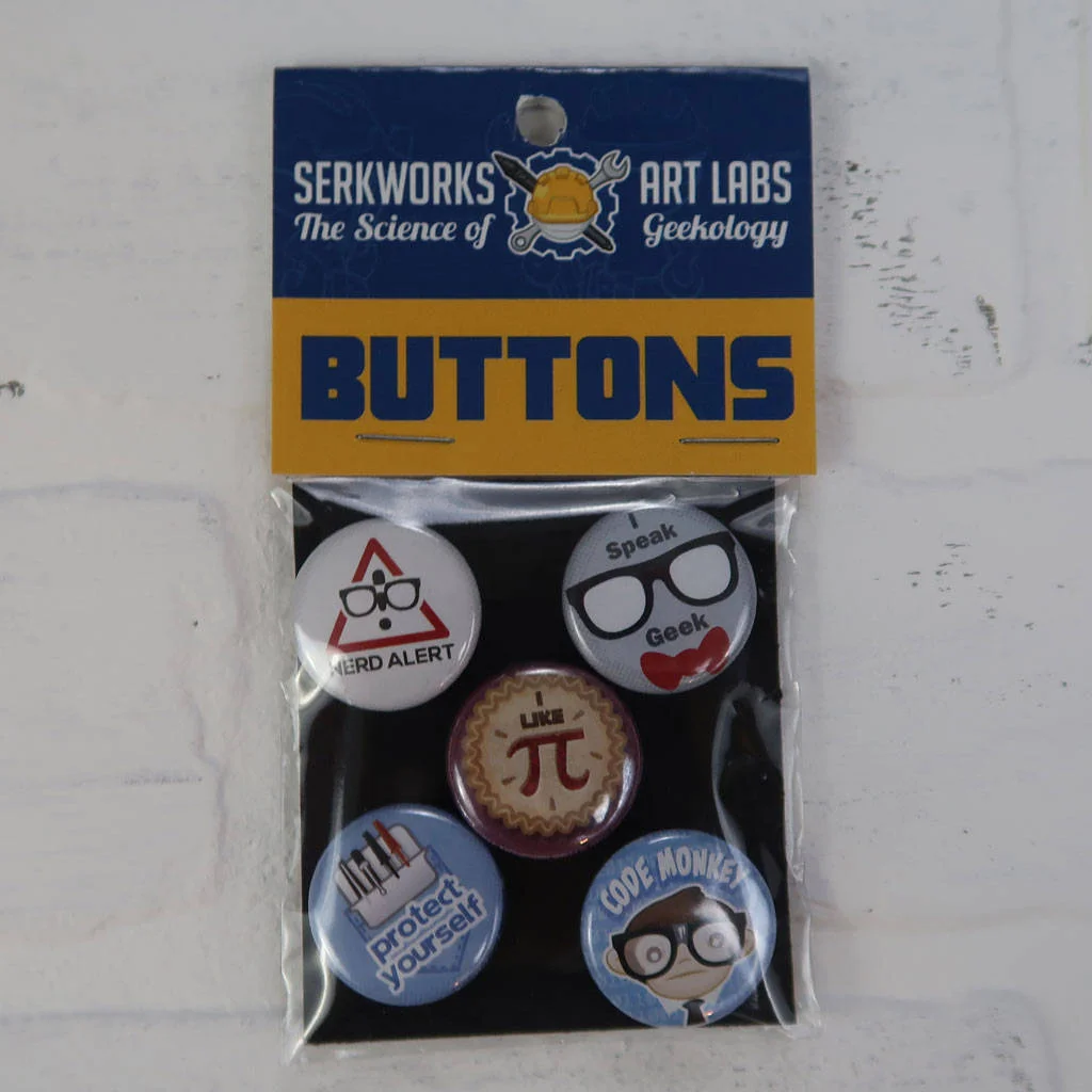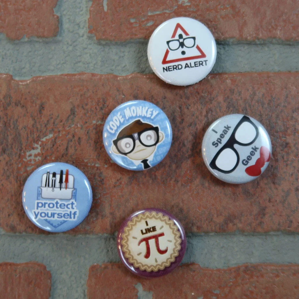 Wear you're geek pride on your sleeve (or backpack, bag etc.) The Geek Button Pack includes these super smart buttons: I Speak Geek, Nerd Alert, Code Monkey, Protect Yourself and I Like Pi