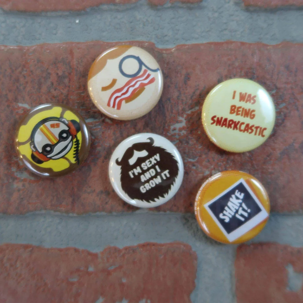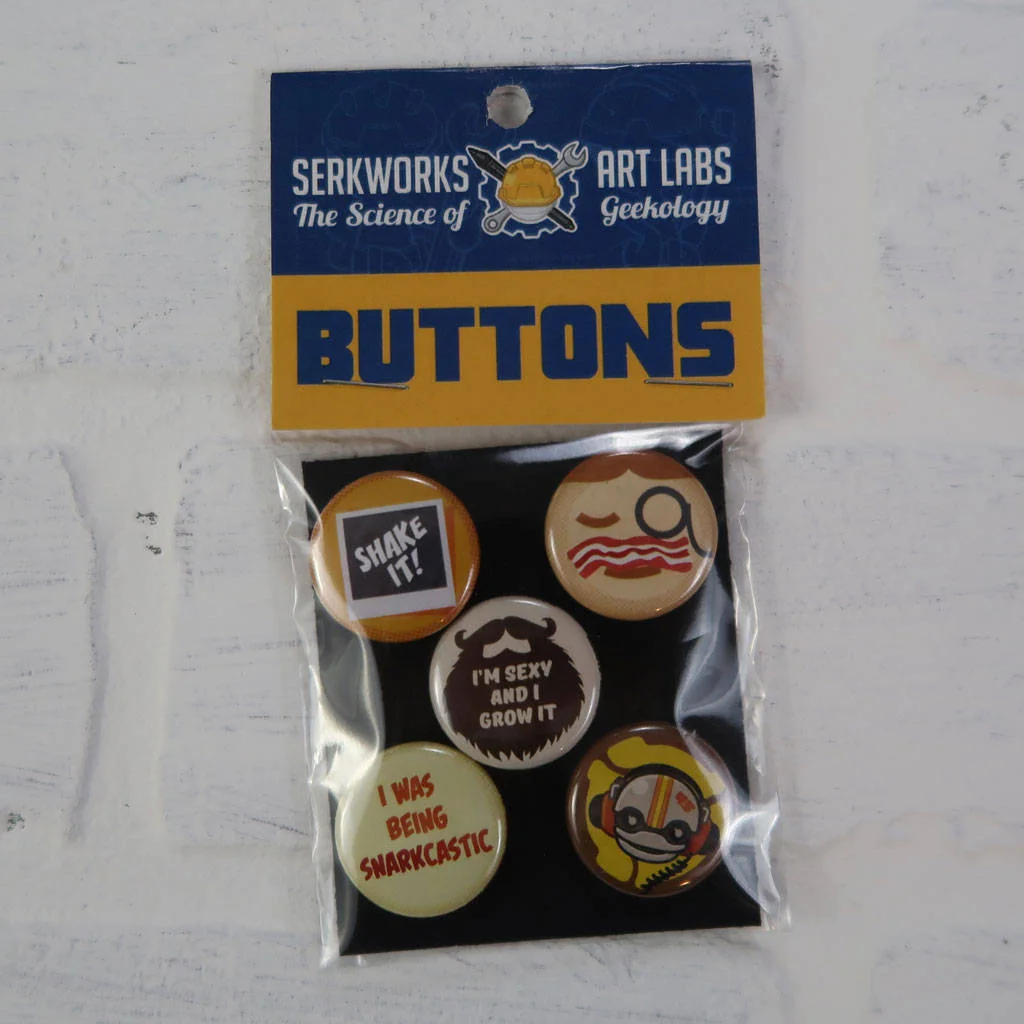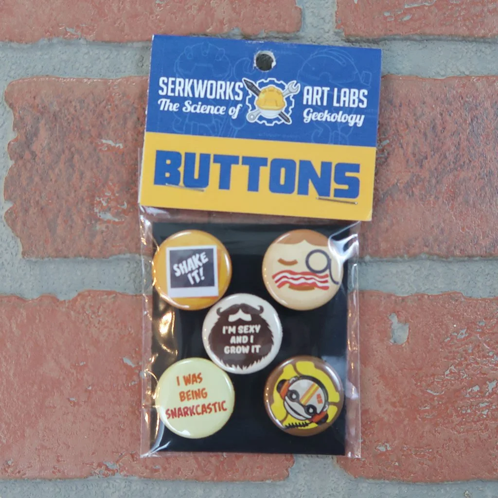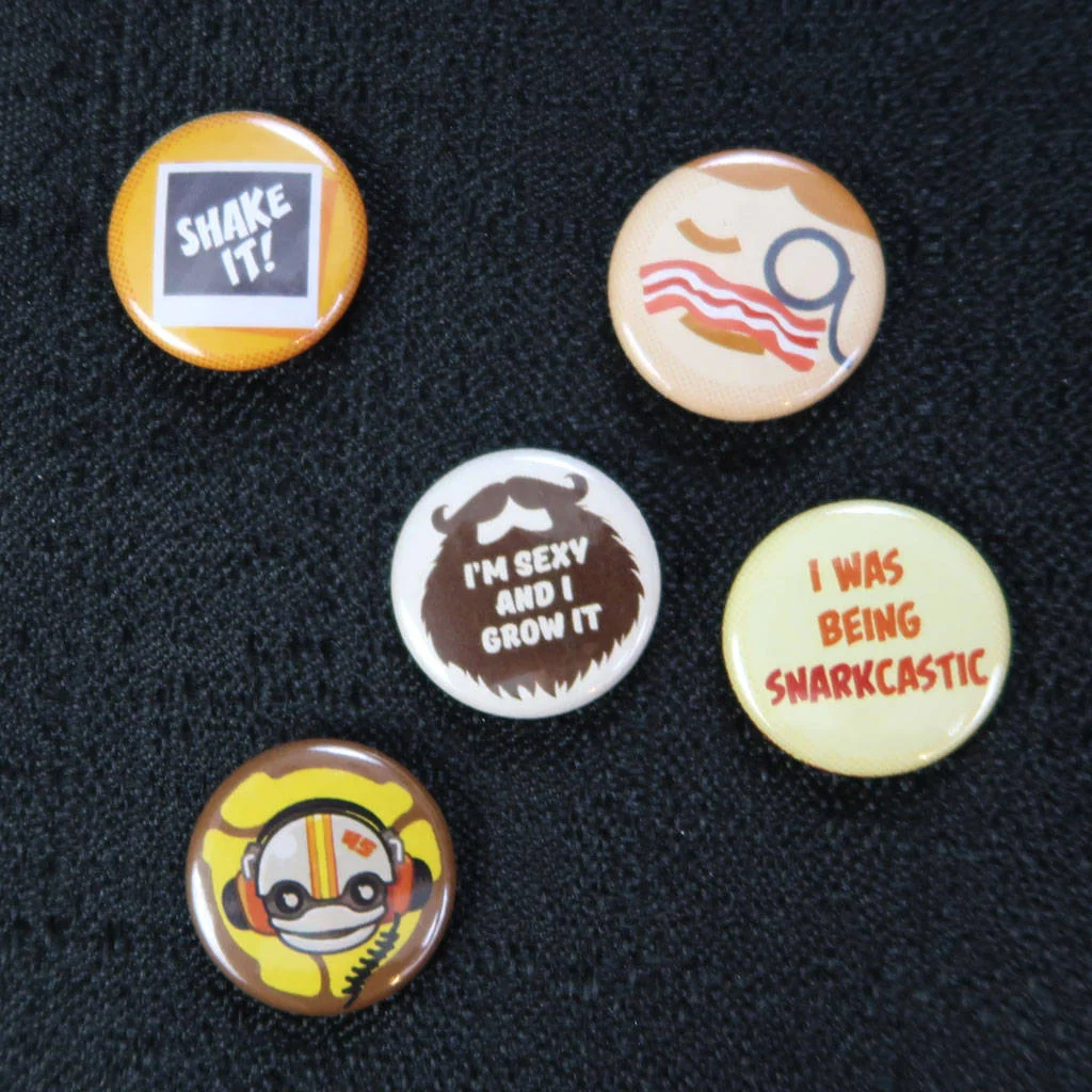 Be on of the first to say I had these buttons before everyone else. The Hipster Button Pack features these five stylish buttons: Sir Bacon-Stache, I Was Being Snarkastic, 45 Bot, I'm Sexy And I Grow It and Shake It!
