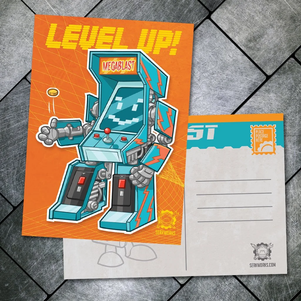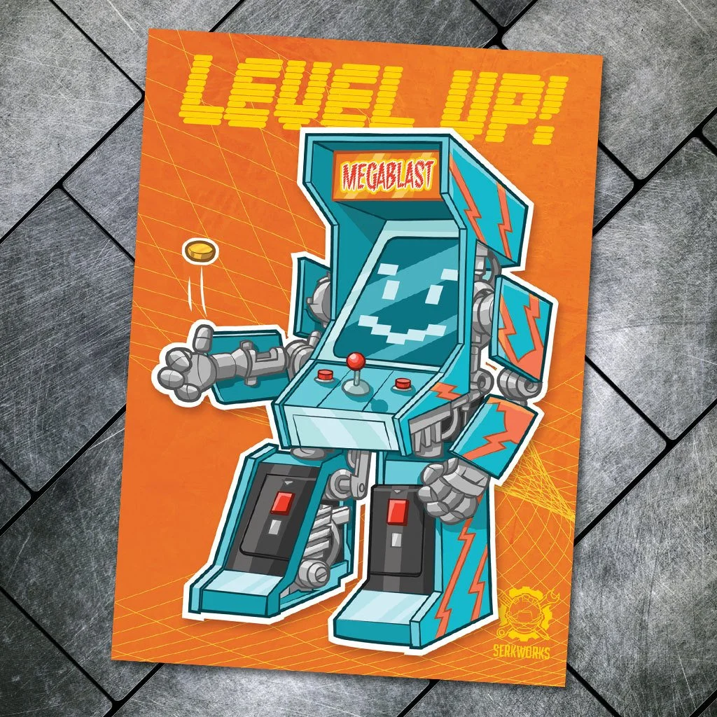 Whatever the achievement, celebrate it with this retro-gamer themed robot postcard. Great as a greeting card or a totally awesome mini print!