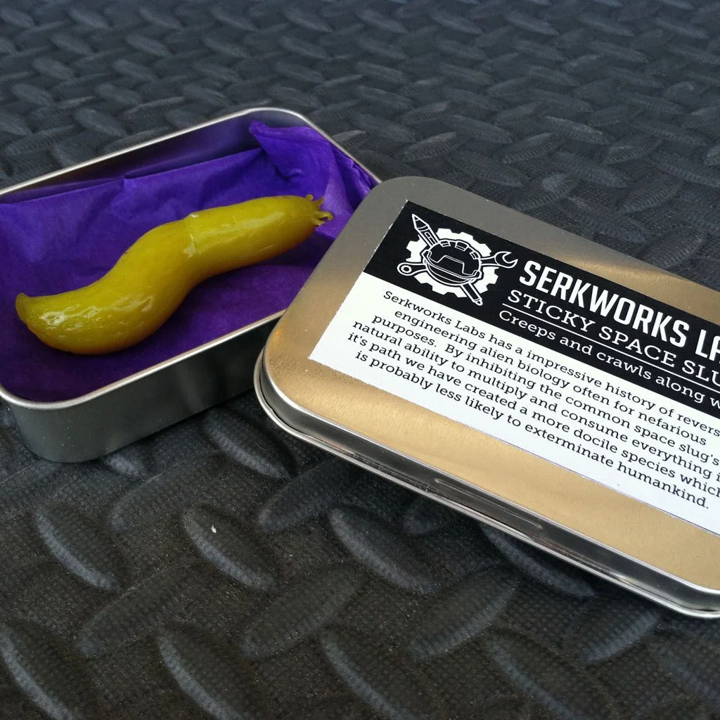 Features a collectable silver tin containing one Sticky Space Slug (colors may vary)