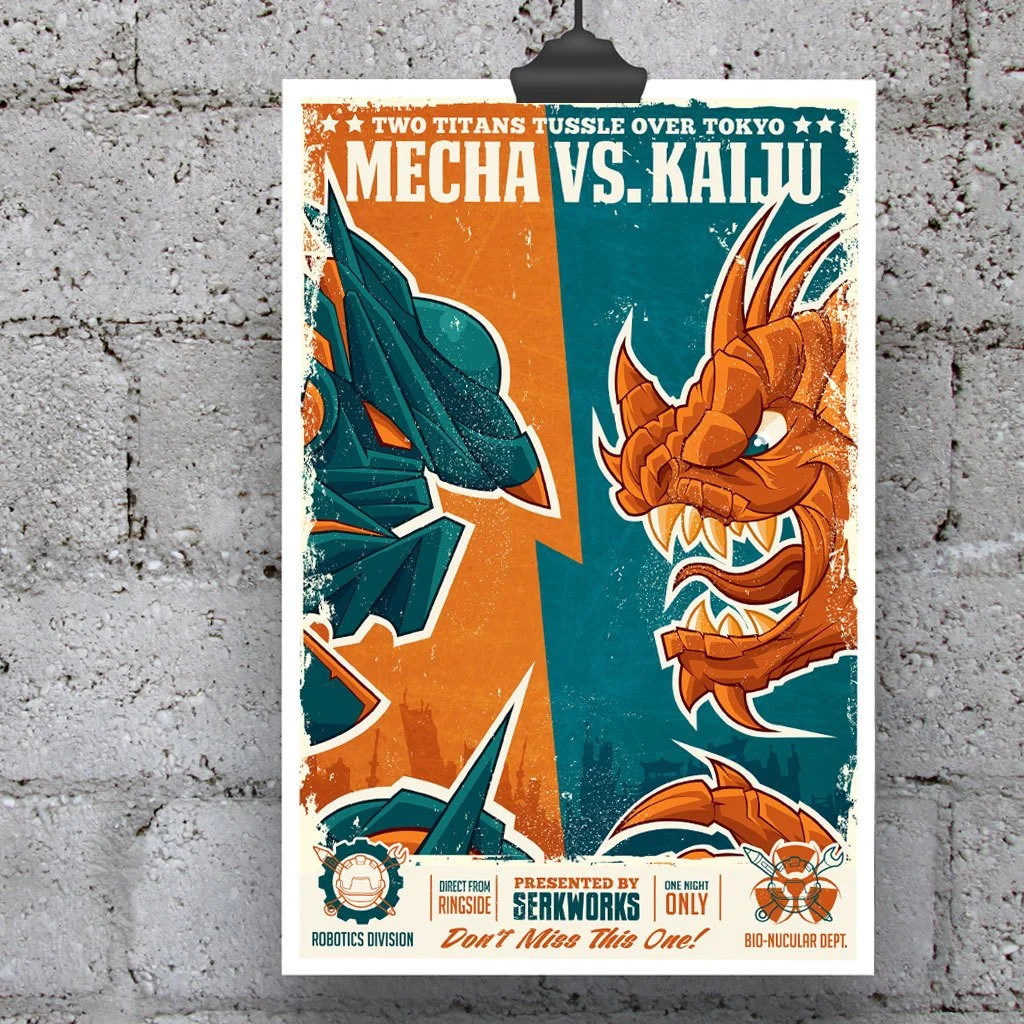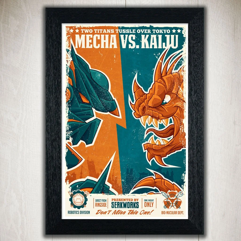 It's the ultimate grudge match! This vintage fight promo features two of earth's most formidable enemies as they face each other head on: the giant mechanical robot Mecha, and the fearsome city-stomping behemoth known as Kaiju. Who will take the title? That's anyone's guess. Don't miss your chance to commemorate this historic event with this awesome print.
