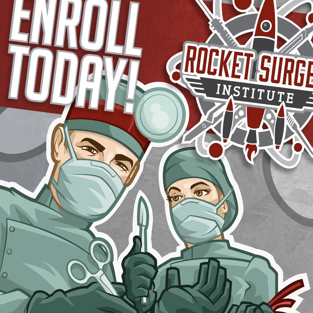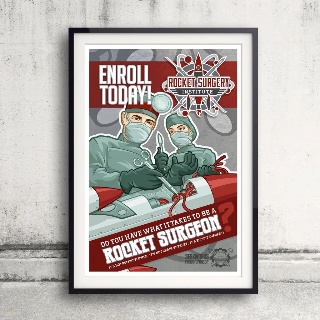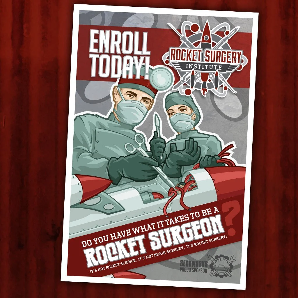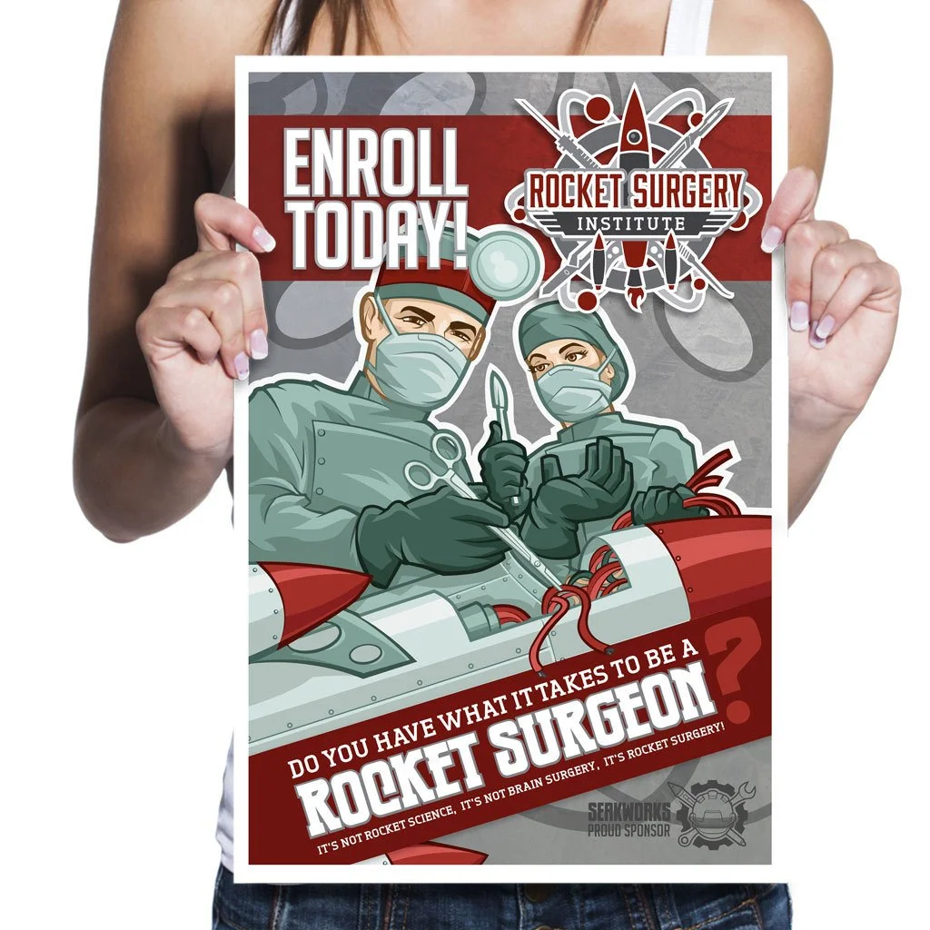It's not Brain Surgery. It's not Rocket Science. It's Rocket Surgery! Serkworks Industries is commemorating its newest venture into the science of Rocket Surgery with this stunning new print. Designed to inspire you to pursue the most elusive and unattainable of all the mad sciences. Dream Big. Achieve the impossible. Become a Rocket Surgeon. Enroll Today!