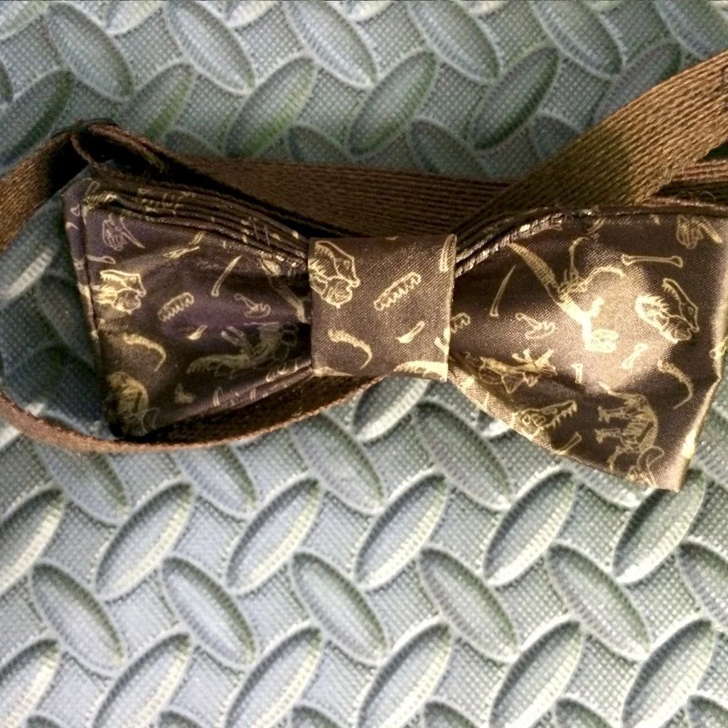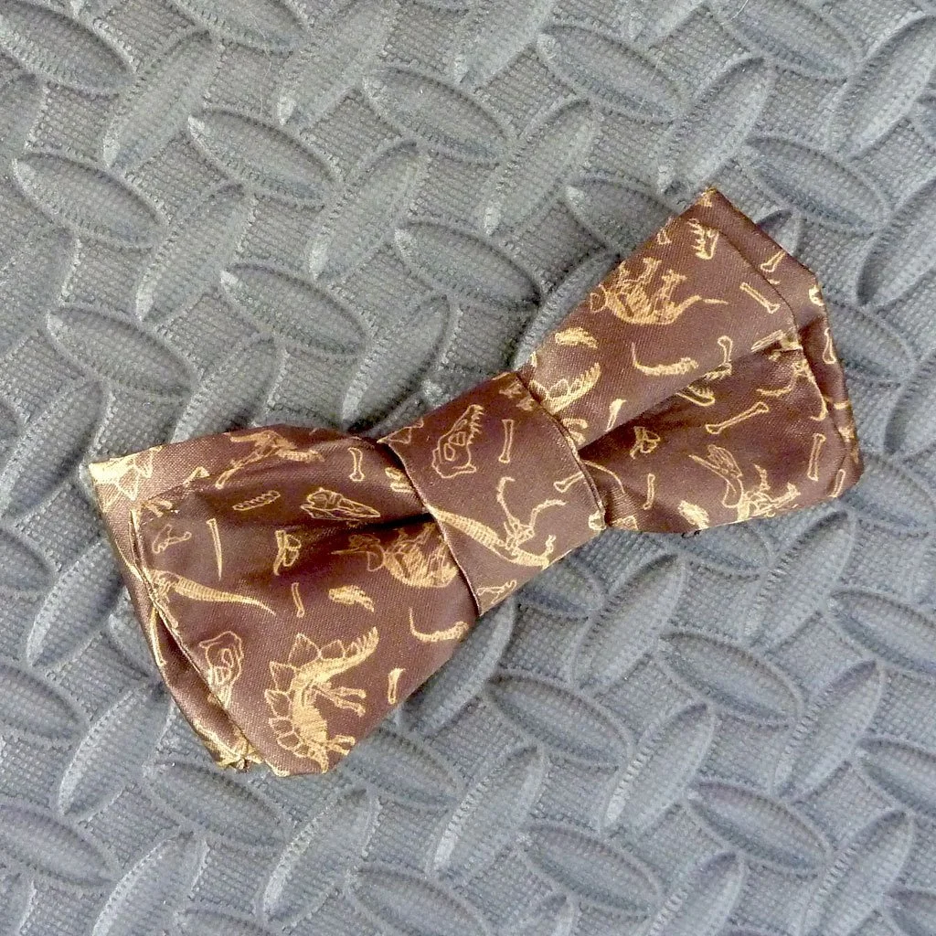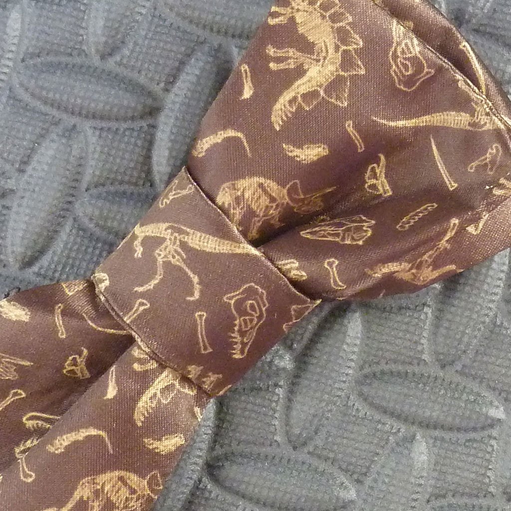 This handsome brown bow tie features gold dinosaur fossils for a classic look that will never go extinct. Can you dig it?
